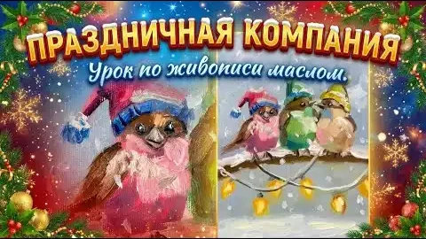 Зимние птички с гирляндой | Праздничная компания – пошаговый урок по живописи маслом